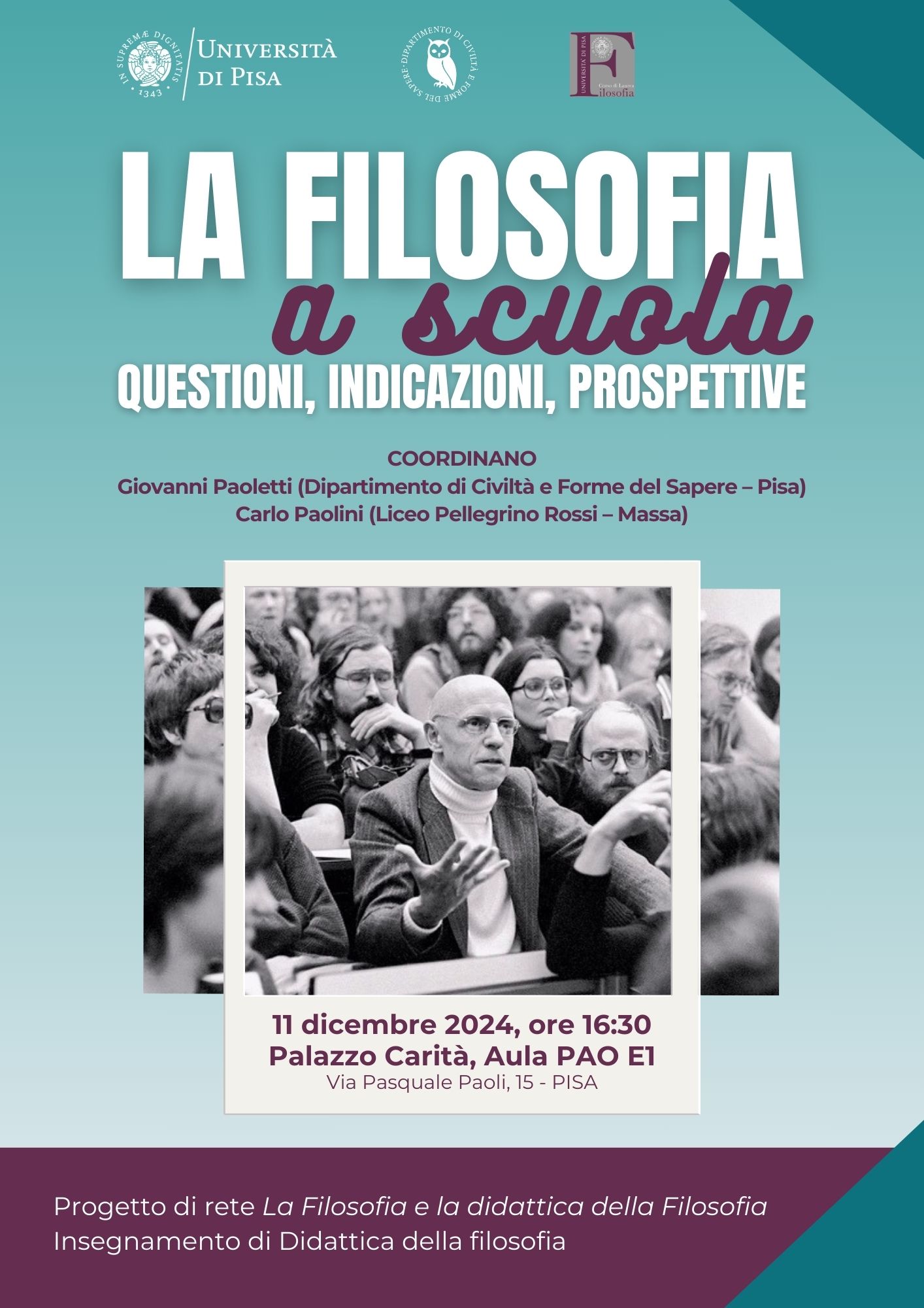 L’incontro si terrà alle ore 16:30 nell’Aula PAO E1 di Palazzo Carità (Via Pasquale Paoli 15, Pisa), nell’ambito dell’insegnamento di Didattica della filosofia del Dipartimento di Civiltà e Forme del Sapere dell’Università di Pisa.